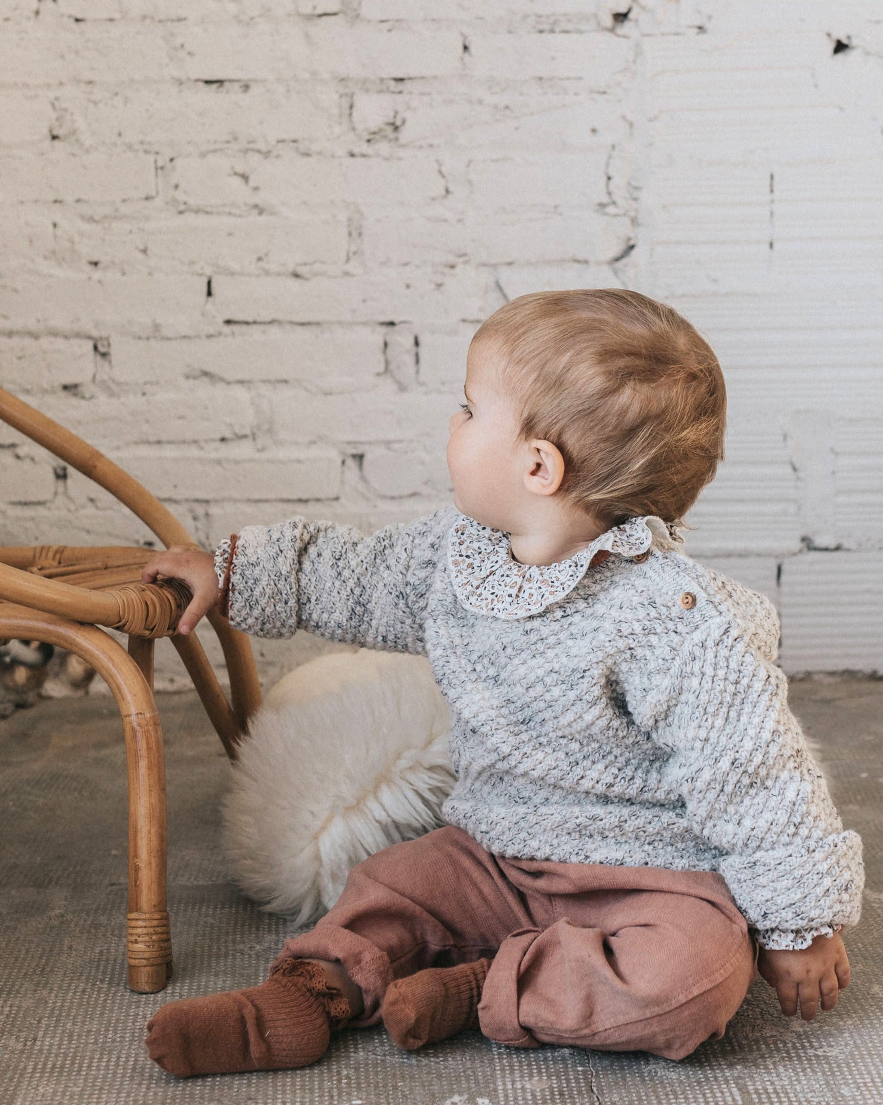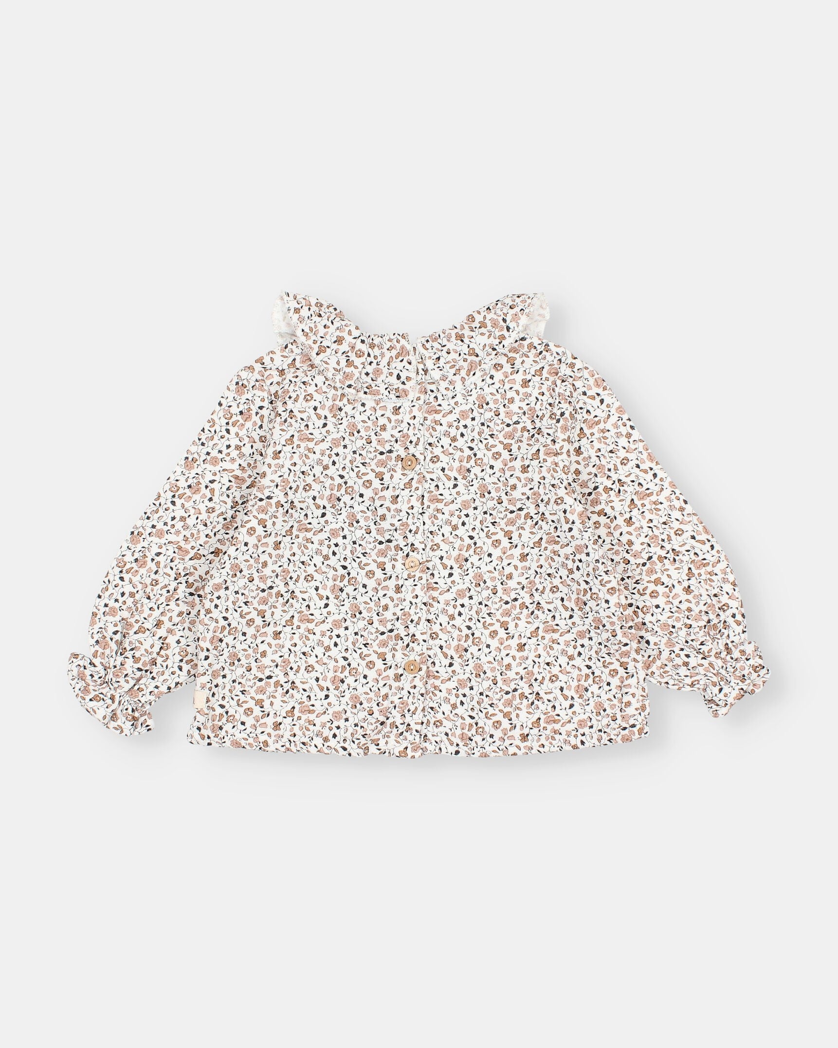 Blusa de doble tela estampado otoño. Volante en el cuello. Puños elásticos. Abotonada en la espalda. Confortable.