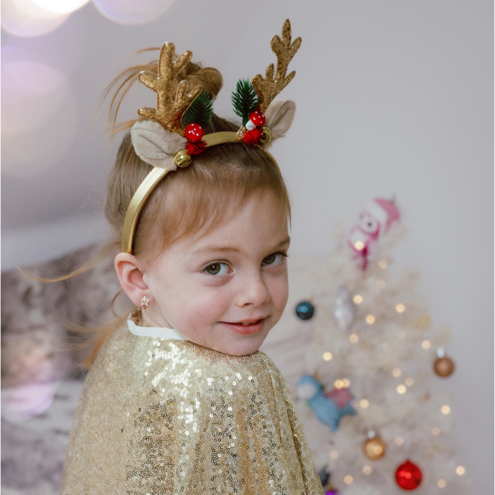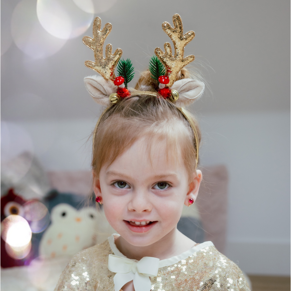 ¡Haz que la Navidad brille con nuestra diadema Holiday Rudolph! ✨ Con cuernos cubiertos de lentejuelas doradas, campanillas tintineantes y detalles encantadores como hongos y ramitas verdes, este accesorio transforma cualquier look infantil en pura magia festiva. Su diseño divertido y moderno es perfecto para completar atuendos de celebraciones, fotos navideñas o fiestas escolares. Ligera, cómoda y llena de fantasía, la diadema Holiday Rudolph no solo aporta estilo, también despierta sonrisas y contagia alegría. Ideal para padres que buscan un toque único y especial en estas fechas, convirtiendo a los más pequeños en protagonistas de la temporada. ¡Un accesorio imprescindible para vivir unas fiestas modernas, dulces y llenas de ilusión!
