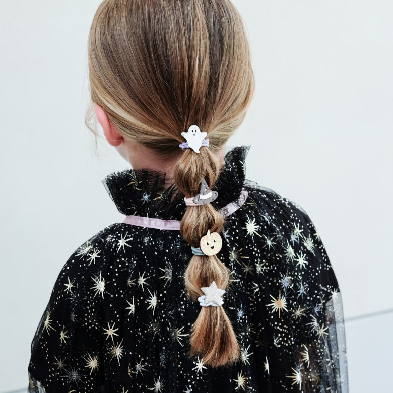 ¡Dale un toque mágico y divertido al look de tus peques con nuestras gomas de Halloween! Este set incluye adorables diseños: fantasma, calabaza, gorro de bruja y estrella, perfectos para complementar cualquier peinado festivo. Hechas con materiales suaves y resistentes, se adaptan cómodamente sin dañar el cabello, ideales para el día a día o fiestas temáticas. Son el accesorio perfecto para madres y padres modernos que buscan estilo y practicidad sin complicaciones. Estas gomas son fáciles de poner y quitar, ¡y harán que tus niños brillen con un look único y encantador! Añade diversión y originalidad a su Halloween con estas gomas que combinan dulzura y tendencia. ¡Un must para los más pequeños en esta temporada!